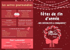 Voici notre nouvelle carte de Noël composée exclusivement de produits issus de l’agriculture, de l’élevage et de l’artisanat de notre chère région. Plusieurs nouveautés cette année : le caviar de Neuvic, la truffe girondine des Pépites Noires, des assortiments de chocolats très fins et des pâtisseries sucrées et salées sans gluten !